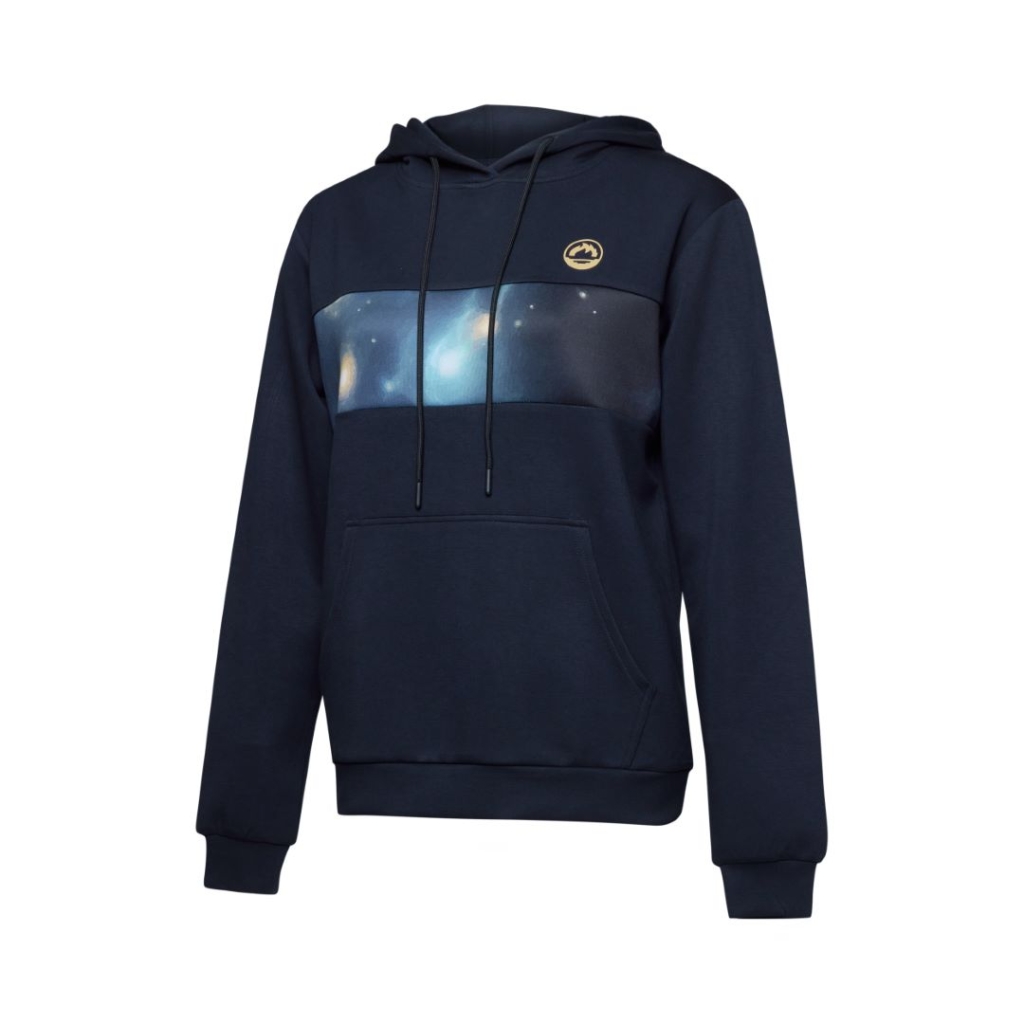 Sudadera de mujer con capucha y bolsillo tipo canguro en color azul marino. Su diseño incorpora una franja con estampado galáctico que aporta un estilo original. Presenta un tacto suave ideal para climas frescos o entretiempo