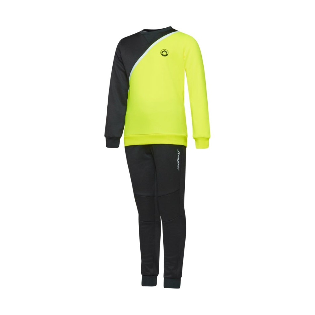 Chándal para niños con diseño llamativo y funcional. La sudadera combina colores vivos con un corte cómodo y resistente. El interior es afelpado para mayor confort térmico. El pantalón incorpora doble tejido en las rodillas para mayor durabilidad, bolsillos laterales, bolsillo trasero y cintura con cordón ajustable